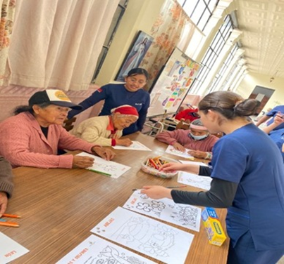 Por otro lado, en los centros gerontológicos los estudiantes interactúan con adultos mayores institucionalizados, lo que les permite comprender los procesos de envejecimiento y las necesidades específicas de esta población. En este ámbito se realizan actividades orientadas a la valoración geriátrica integral, apoyo en las actividades básicas de la vida diaria, promoción del envejecimiento activo, estimulación cognitiva, acompañamiento emocional y fortalecimiento del trato humanizado hacia el adulto mayor.